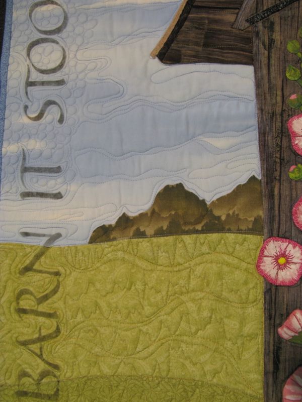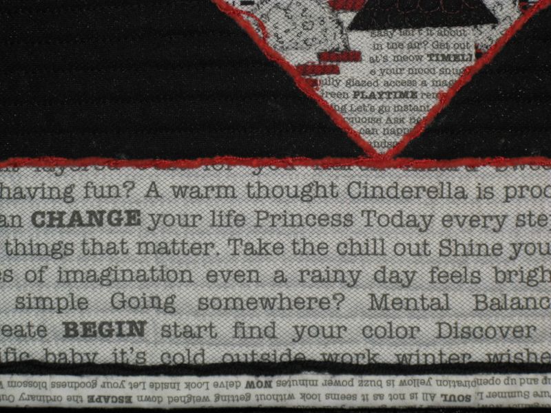 (2 & 3) Over that, I layered this Thermolam Plus, using straight pins to anchor it into place. The fabric really sticks to it – like magic, and when it gets all thready, use one of those sticky roller things that is used to clean off clothes. NOTE the number on the upper left side (TP970). That will save your bacon when you go into buy more, because now they’ve renamed it Quilter’s Batt or Fleece or Something or Other, and you just have to go through the bolts to find this magic stuff.