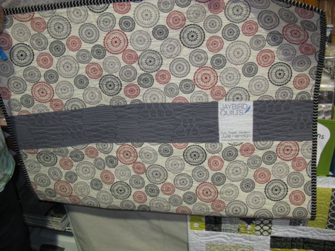(1) How I built my pin wall: 2 sheets of 1/2″ foam core art board taped side by side, covered with gridded flannel bordered by plain flannel. I wish I had more gridded flannel, but at the time, that’s all I had. I have seen it at JoAnn’s. Then I wrapped this layer to the back and stapled in place using really short staples, then covered that with tape. I then affixed it to my wall by using door jamb covers–long rounded metallic bars, each about six feet in length; I used four: two for each side, top and bottom. I also put a flat washer on two screws and screwed them into the wall at a stud, at the midseam of the foam core art boards.