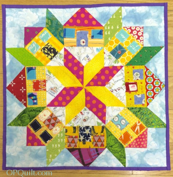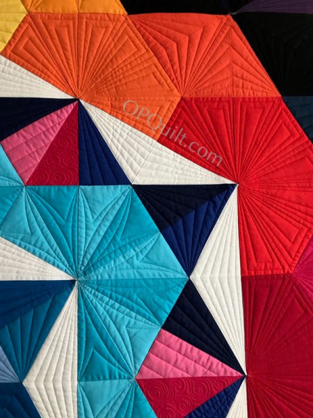 The wild and crazy back. It’s “prairie house” from the De Leon Design Group, for Alexander Henry Fabrics. I thought it might disguise any oopsies, but I was happy to note that I actually had very few. I guess maybe after ten years I’m getting better at the quilting? Much credit belongs to the Sweet Sixteen machine I use, and the threads, which always seem to balance so well.