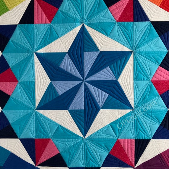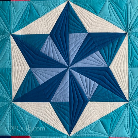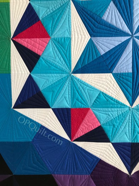 After one quilting session, when I turned it over to check the back, I noticed I had quilted in this wedge-shaped scrap onto the back. I started to try and cut it out, then decided I kind of liked this nod to the process, so left it in. Really, you can’t see it, when looking at the overall back. (Well, NOW you do, but you didn’t at first, right?)