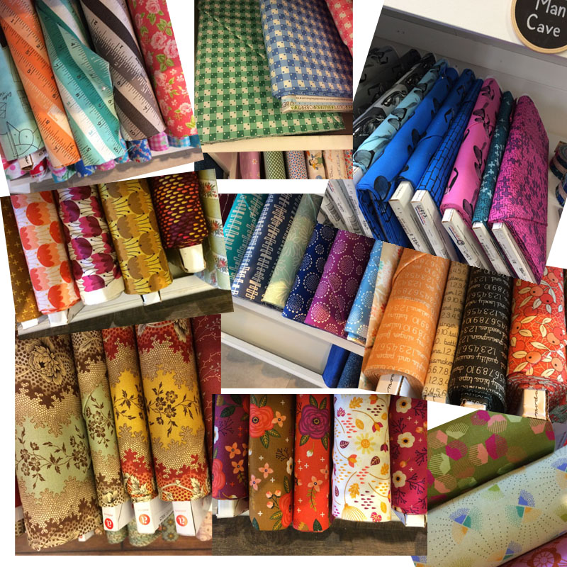 Quilting cottons and their equivalent of fat quarters in front. 180 yen is about $1.60, and these pieces are suitcase-sized, coming in at about 14 by 19 inches.