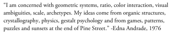 Why are we loathe to state our sources of inspiration? Does it diminish our efforts, or is it really unnecessary? Andrade didn’t acknowledge the other hard-edge painters in the corners of her paintings, but Wikipedia notes that: