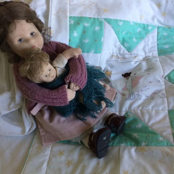 One interesting drawback to this whole one-arm thing, is that you can’t clean up the sewing room very well. So the day after I got my sling off, I noticed the pile of Sarah Jane scraps on the top of the cutting table, as it was one of the last projects I did before heading into surgery. I had wanted to make Eliza a doll quilt to match her big-bed quilt, and now was my chance. I scissor cut some pieces, sewed them together, and finished the top.