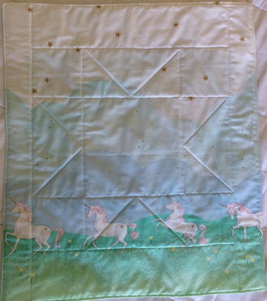 I tried quilting my HQ Sweet Sixteen, practicing on a quilt square scrap, but it was a no go. You need two hands for that. So I used my walking foot on my regular machine and was able to get it quilted. Off it goes into the mail today!