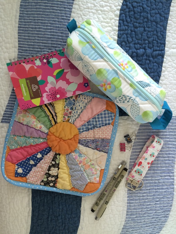 Elizabeth’s Project Folio, front and filled with my next project, a bag made of Keiko Goke fabric