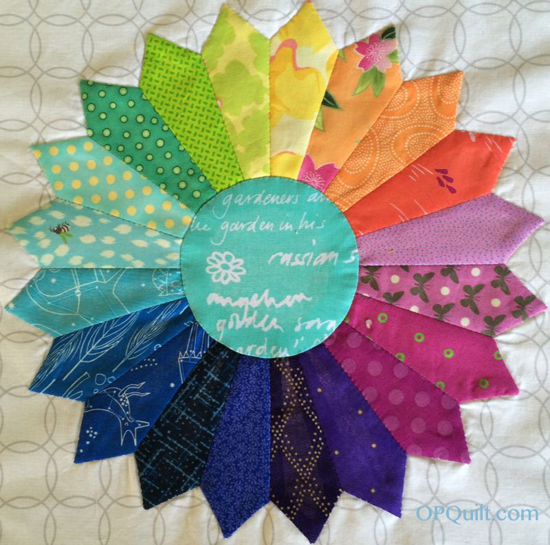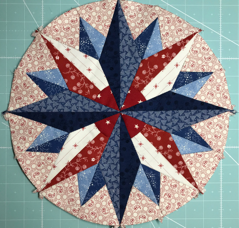 Nothing prettier than a Dresden Rosette. But we’re not done yet. I’ve stitched the three sets together, but if you look at the photo at about 1-o’clock on the dial, you can see I’ve left one complete seam open. Trust me when I tell you it’s easier to sew the outer wedges on, if you have not sewn it into a circle.