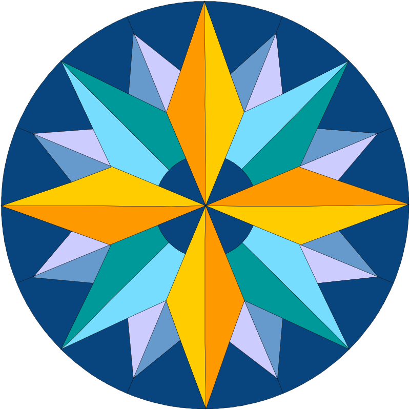 In the original illustration, the colors bring a dimension that I can’t get with the red, white and blue: the wedge points sink into the background and the bigger points come forward. Have fun choosing colors for yours and making one of my Shine blocks!