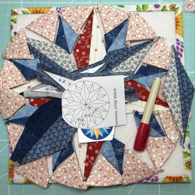 My original Shine quilt had sixteen blocks, done in multi-color fabrics, a bright and sunny quilt. I built them one-by-one, drawing them on paper at first, and had them free here on my website. When QuiltMania and I agreed to collaborate (complete details in this post), I pulled them from the website, with the caveat that I wouldn’t release them until March 2021. But today, I have for you again, a new free EPP pattern, as well as news of an updated pattern.