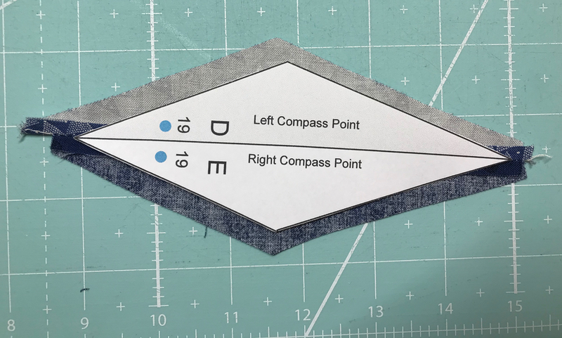 I use the quick trick found in the General Instructions in the Nine More Blocks Pattern, and seam some of the two-part pieces on the sewing machine. Then I lay out the pattern piece and randomly cut around it, trying to maintain a fat quarter-inch seam allowance. The blue dots on the pattern remind you which way to place this (dots are nearer the center), as it is slightly asymmetrical.