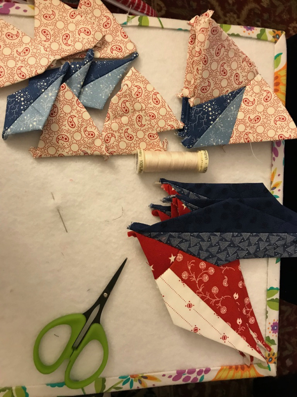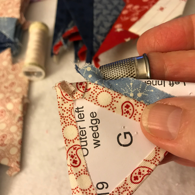 I then started sewing the inner wedges together. This is my typical night-time EPP photo, as I like to hand-stitch while watching TV at night. I used the shortcut trick also on those smaller two-toned blue triangle pieces. Then, keeping track of which side goes where, I am now sewing on the side pieces in light red/white.