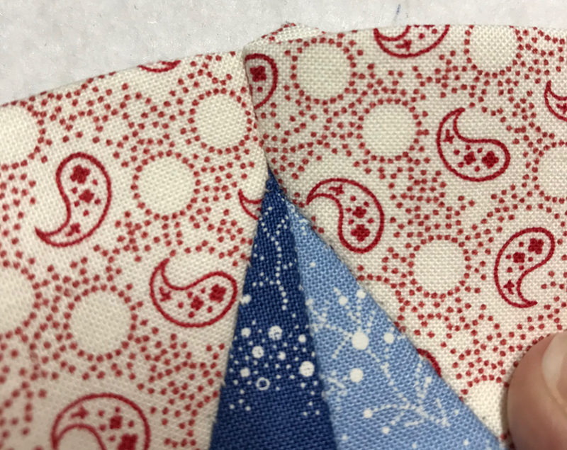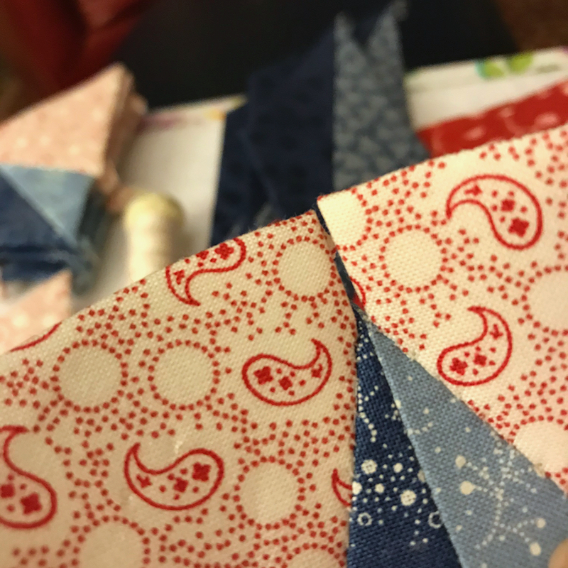 Time to sew the wedge units in-between a red point of the star and a blue point. Start at the top of the point, lining up the units, RST, and sew down into the valley. Take an extra stitch, re-fold and re-line up the pieces, and sew back out of the V-shaped valley.
