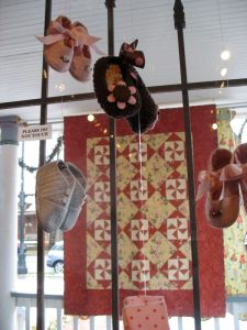 Tracy’s raw-edge applique circles-onto-squares will be completed soon as she’s speedy. What kind of fabrics? Dots!