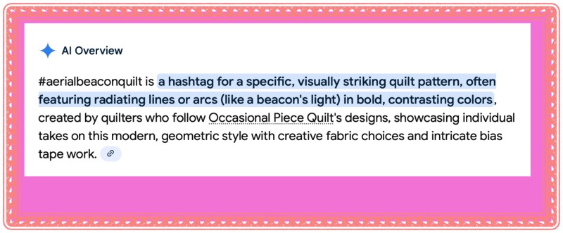 Truly, it was only a matter of time until AI found me; I love how the system just makes stuff up. Hope they enjoy hoovering up all of my blog and creativity! (I am working on my Aerial Beacon pattern.)