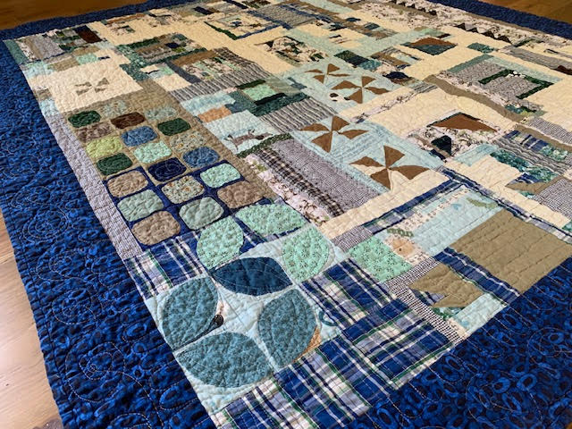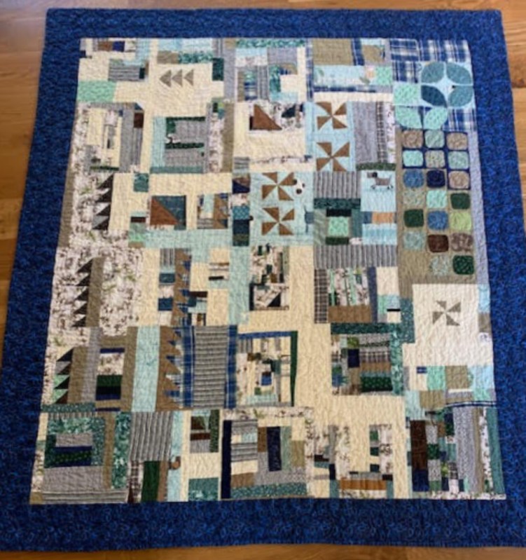 “One of my favorite new things to do is when I make a more “regular” quilt, like all Log Cabins or all Courthouse steps (albeit wonky improv versions, with lots of scraps) is to make improv blocks at the same time as I am making the “regular” quilt, with the offcut smaller pieces that don’t fit into that regular design, and I just set them aside at the time, each day while I am making that “regular” quilt, to “clean up” the scraps of the day. Then as soon as I get the current “regular” quilt bound, I begin the very next quilt starting from those improv blocks, and add as many more blocks as I need, of the same/similar colors.”