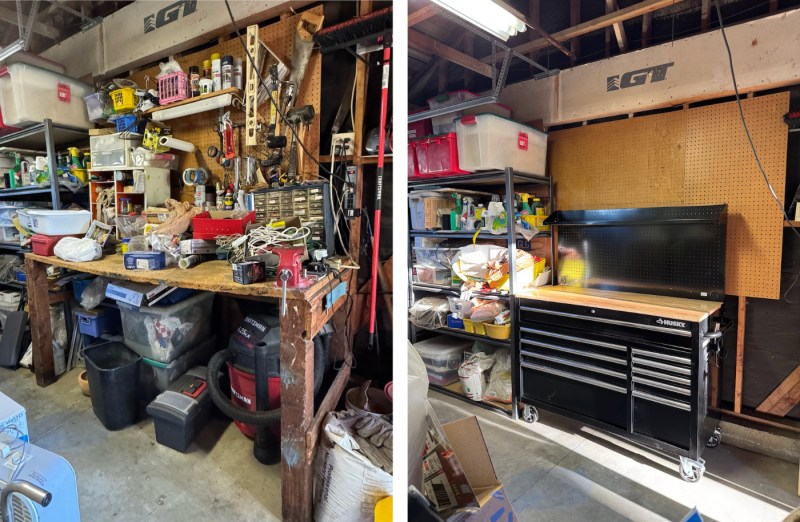 In other construction news, I finally made good on my threat to dump the 50-year-old “workbench” table (left) and replace it with something more modern. Of course, my timing was great as we don’t use much more than a screwdriver and a hammer these days, but hey: we’re equipped. The bulky item trash people have already been called, and will be here shortly to haul a lot of that junk away.