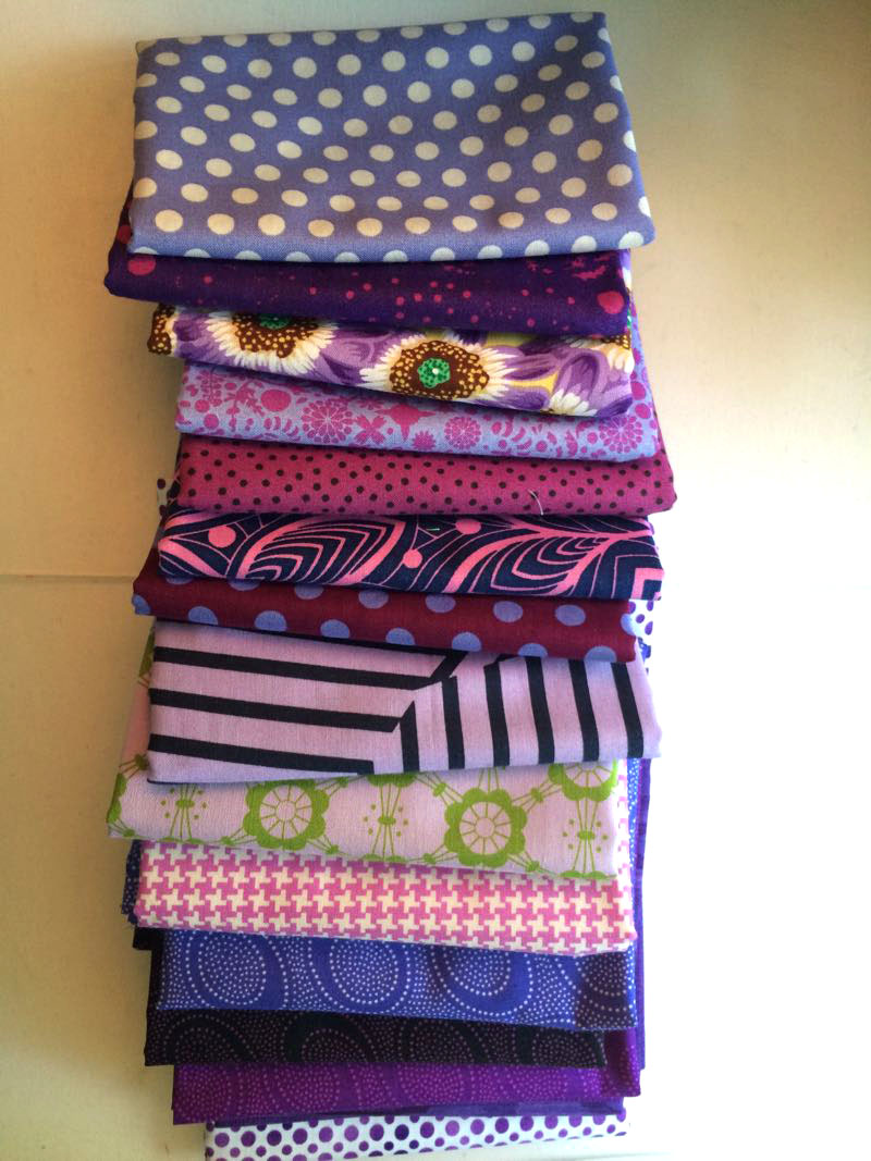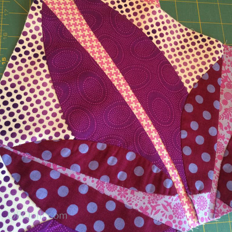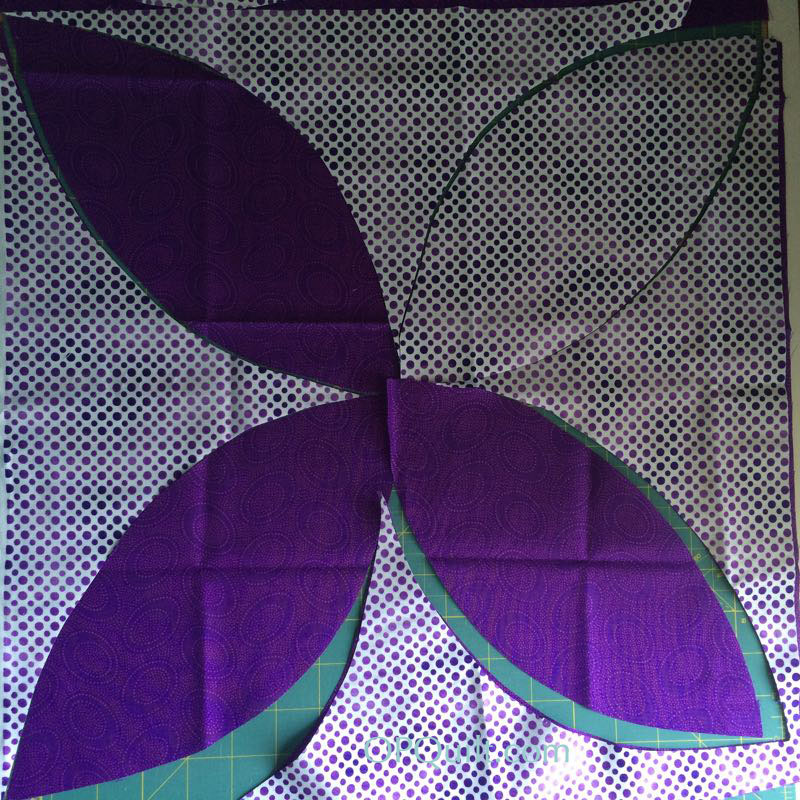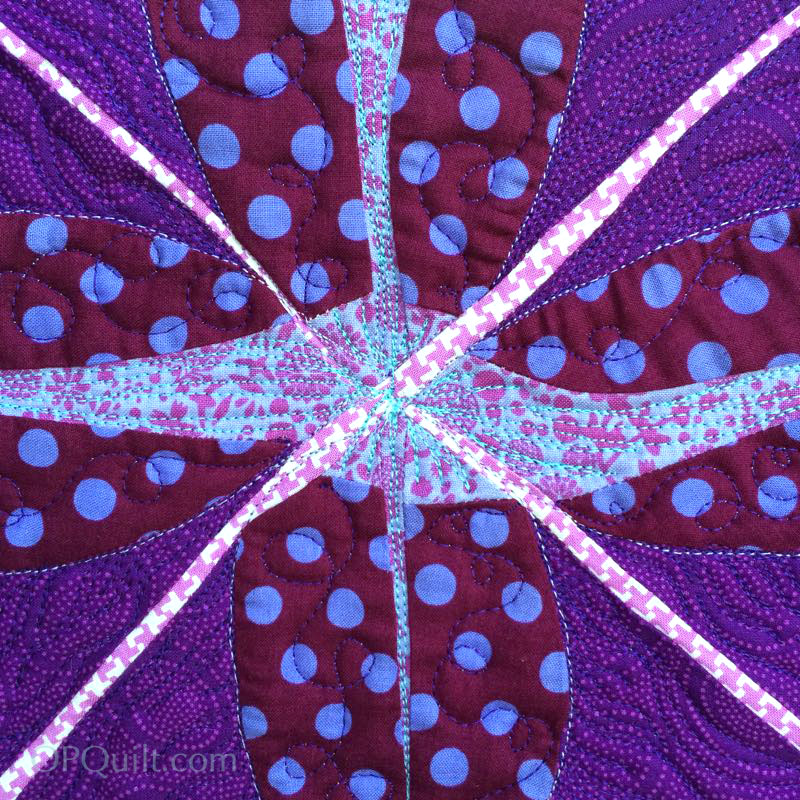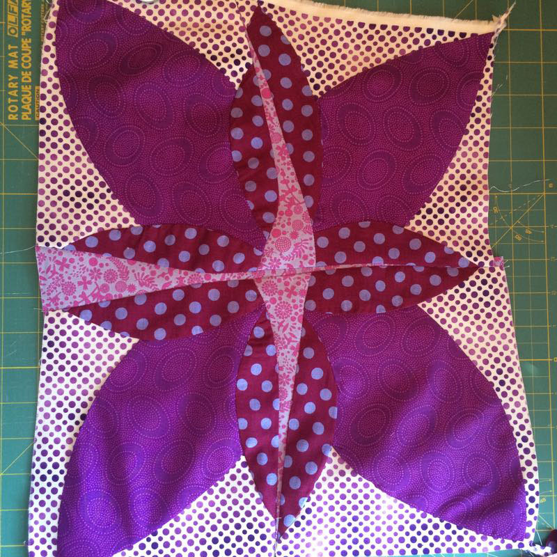 I constructed the bit I wanted to by paper piecing, then plain-old-pieced the rest. I stitched it to a white square, then a chartreuse square, as the purple was just lost on the quilt, plus it imitated the circle around the molecule. I made different sizes of different fabrics, then finally, small circles. Then came the arranging: