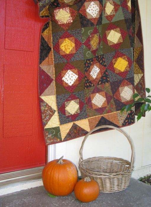 Last year around this time, I had a different quilt slung on the fence, and was working on two autumn-themed pillows Mr. Pumpkin and Crossed Lillies; seems like working with these colors is an annual festival.