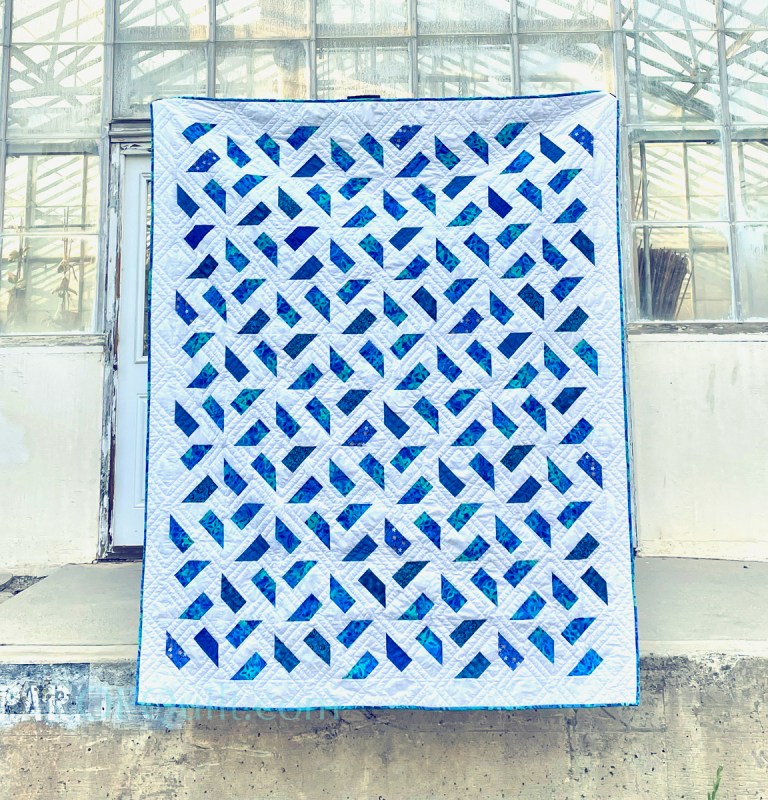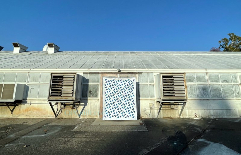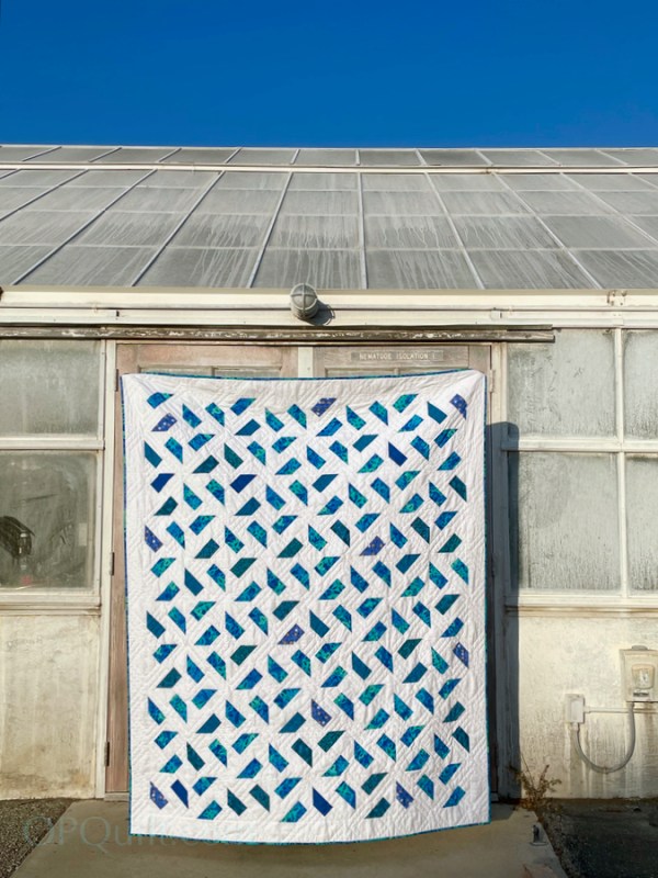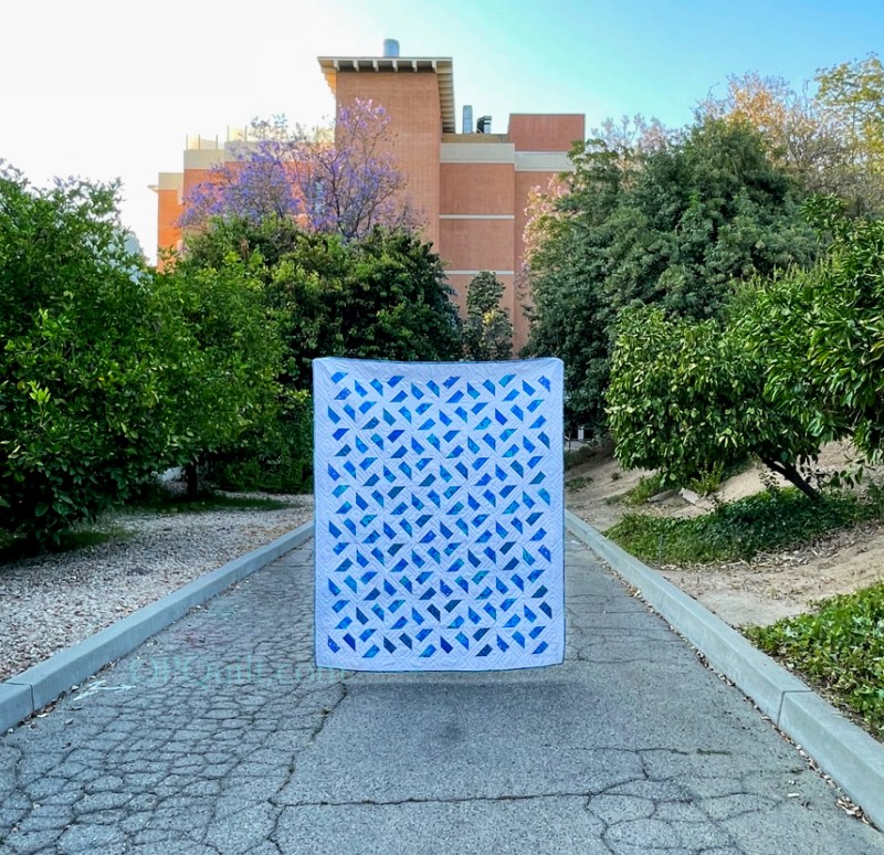 Our wisteria was dropping leaves this week, so here’s the requisite “fall” shot from Southern California. The blue fabrics are just ones I had in the stash, a full spectrum of rich, deep colors. Every so often, I feel like a label would interrupt the quilt back, and not that important (no lectures, please), so I leave it off. This happens like (wait for it) once in a blue moon.