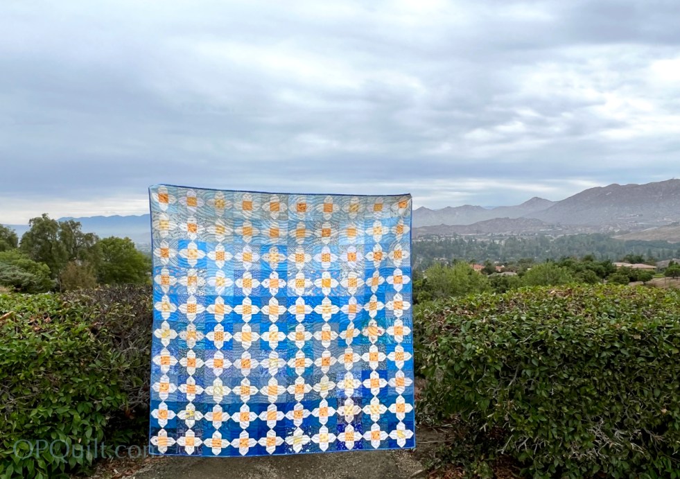 Jen’s quilting, using the E2E pattern Funky Fans really complimented the repetitive nature of this quilt. I think of this as a calming quilt. I have another blue quilt, also quilted in a repeated curving design, also calming. Here they are talking together: