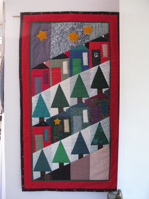 Quilting: First I stitched through the quilt sandwich on the raw-edges of all the house and tree shapes, letting it be slightly wonky as I went. Then the top-stitching on the stars. I switched to white thread and did a loose, large meandering quilting around all the shapes.