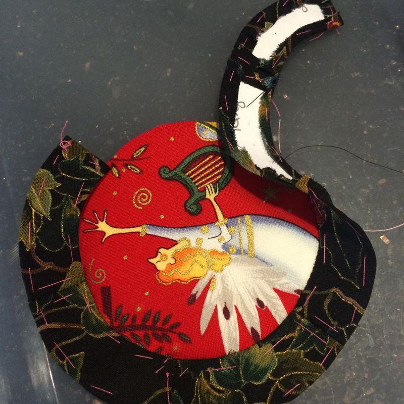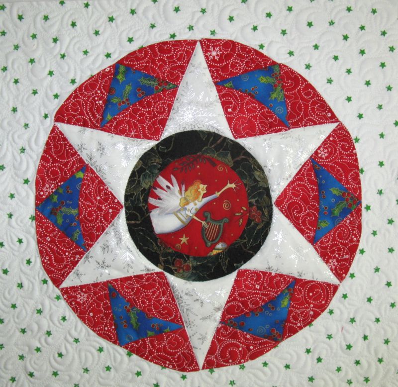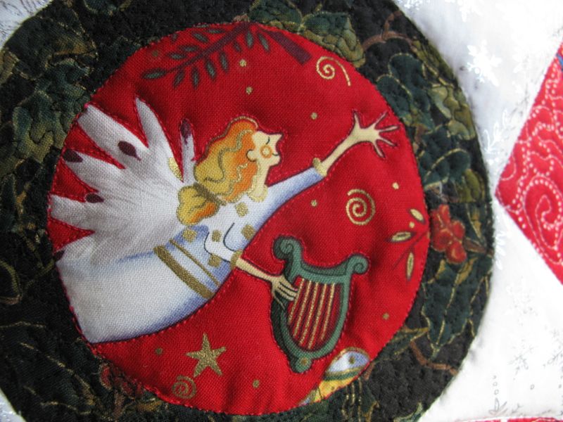 One thing I learned from Sandra Eichner’s blog is how to let the batting poof up under a design element by stitching towards it. First I did the red pieces in between the star points in a meander, trying to quilt toward the star points large and small. Then I went for the outer margins, having fun and letting the machine roll. Black thread and a tiny stipple for the inner ring, dodging the berries, and then outline the angel in the center in order to control the fullness of the batting. Lastly, I outlined everything, using my even-feed straight-stitch foot.