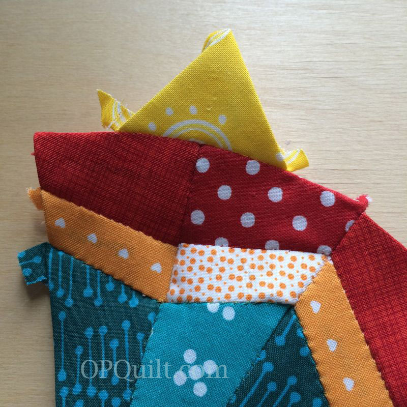 Repeat the pinch-to-find-center-action and sew on the next point. I always take a stitch at the point corners to join them to each other.