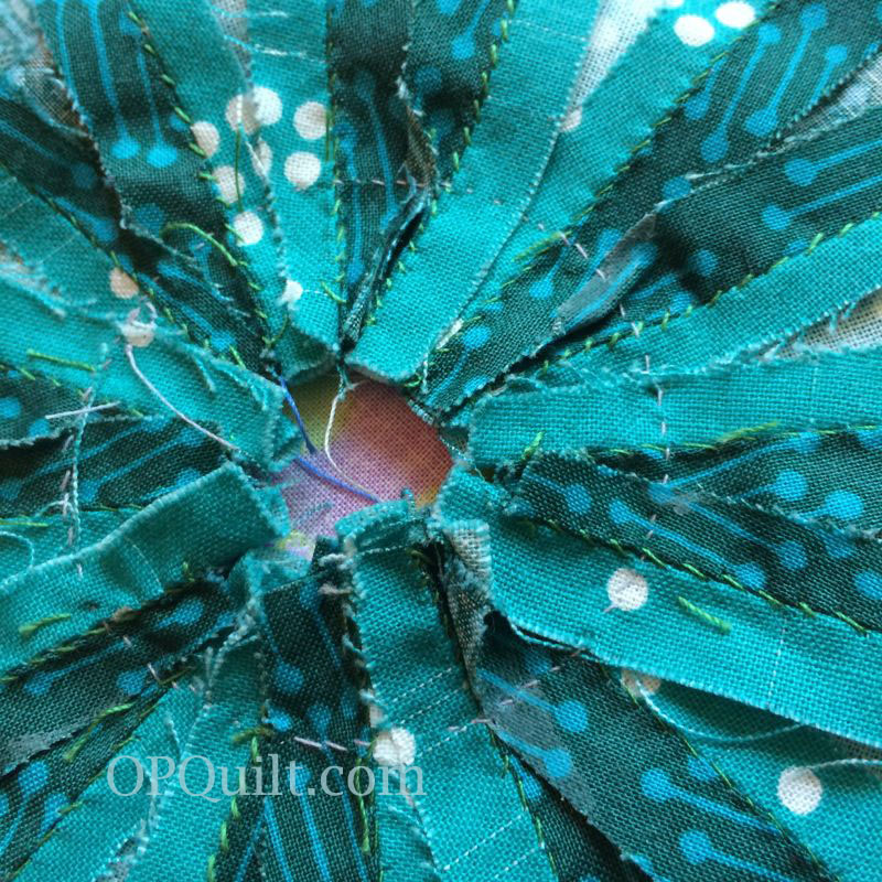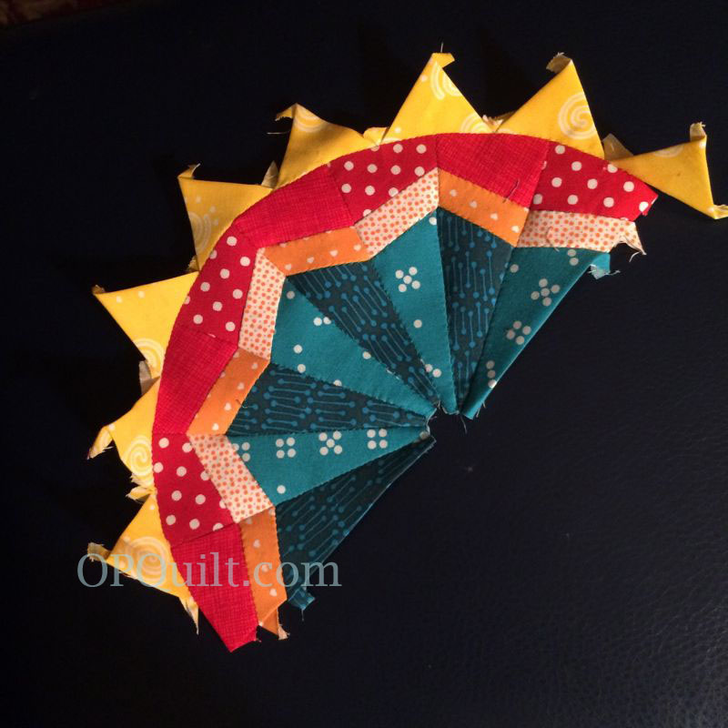 Join the blades of the rays together. Because I have such strong color shifts in these pieces, I opted to use different colored threads in each section. Here I’m sewing the teal pieces together, then I’ll switch to other thread and join the next band. . . and the next.