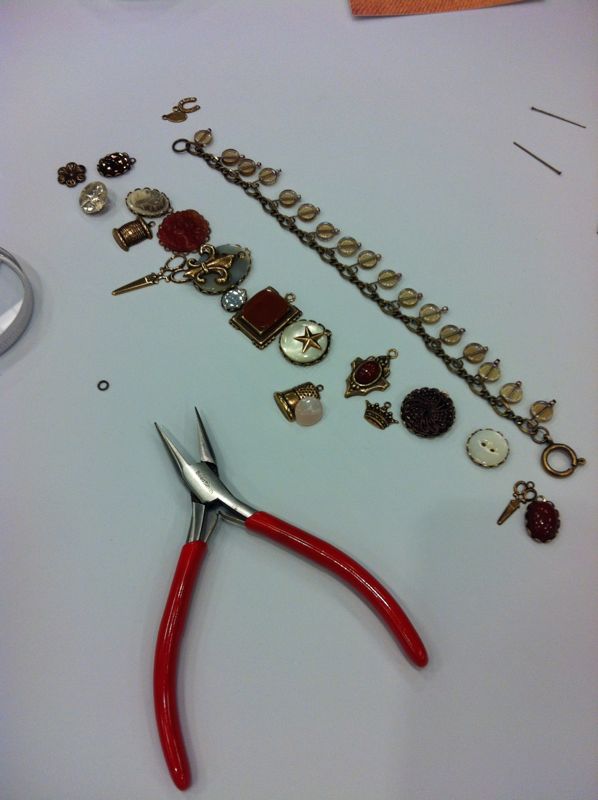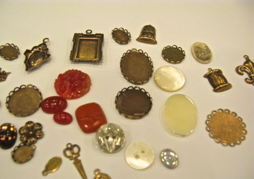 Pieces spread out: the cabochons and the bezels and the charms. You had to be there.