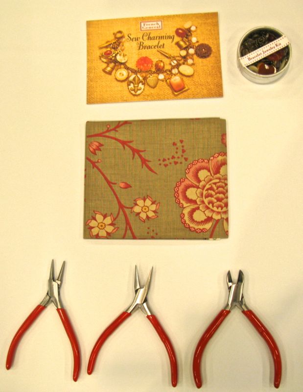 This was on our table when we arrived: the jewelry kit, tools and a fat quarter of her fabric to use as a working mat. Like many others, I tucked the fat quarter away in my bag–no way I was going to get glue on that!
