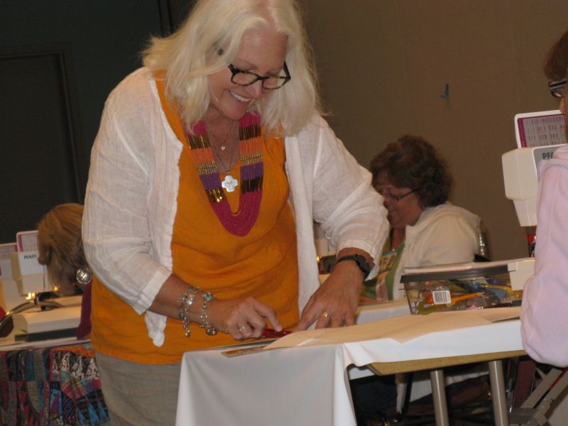 It was interesting to me as she talked about fabric choices, that it makes a difference when picking fabrics for the pieced arc, as to which fabric is used for the pointy things and which is used for the background. Choose the fabric that pops off the other, she said. In this photo you can see she draws from many many fabric types and colors, but she noted that each block should have the colorway of the whole quilt so it’s harmonious.