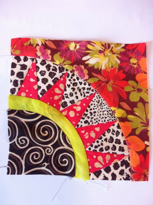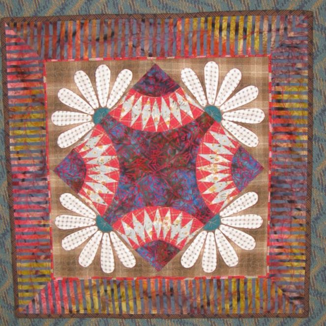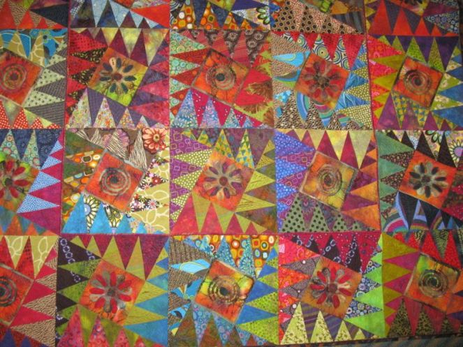 This sample was for another class also, but her combination of colors is just inspiring–not any that I would have gone for but that work together beautifully. She says to mix everything up: batiks, 1930s prints, modern, calico, Kaffe Fassett. . . everything.