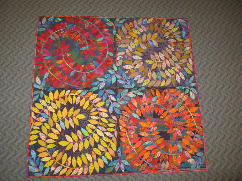 Karen Stone makes me laugh. Like when she brought out this first quilt (above, and detail just below it), a sample for another class, and asked, “Do you want to see some irrelevant quilts?” Of course we did, and I loved this one with all the raw edge applique leaves coiling around.