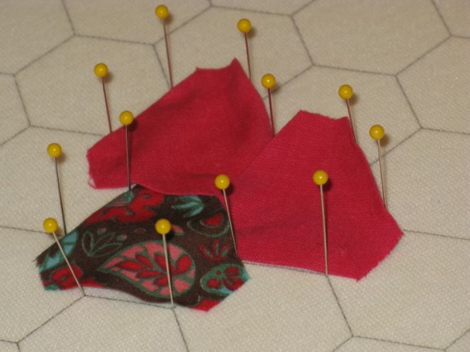 It looks like a puzzle on the back. Using a lightweight cardboard template, iron just three sides of the hexagon, then fit them together, joining them with a narrow zig-zag stitch done with monofilament thread.