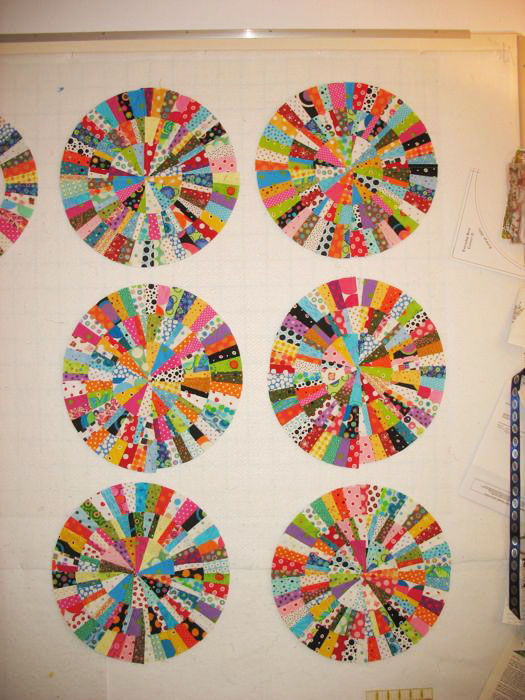Well, the truth is I was kind of moaning a wee bit to Rhonda, as it seems to go sooo slowly. But she noted that “It’s also theraputic, isn’t it?” She’s right. I can listen to the radio, to podcasts, to novels (my mother and I are listening to Things Fall Apart), and just let my mind wander and stitch. She called me this morning to tell me she’d dragged her dotty circles quilt pieces out of the closet and had started to work on them again. I loved the coincidence that I was working on something that she’d already started–great serendipity.