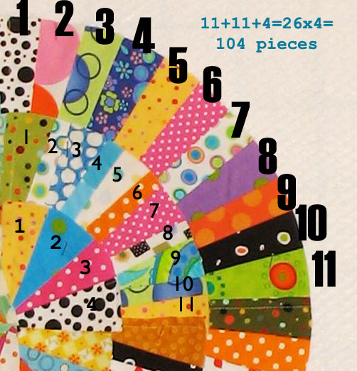 Three arcs per 1/4 block. Eleven pieces on the larger outside arc, eleven pieces (smaller) on the second arc, and 4 on the center quarter-circle arc. One hundred and four pieces per block. I haven’t even put the four pieces on the outside of the circles to square it up. And this is only the center section.