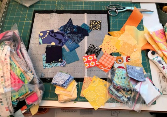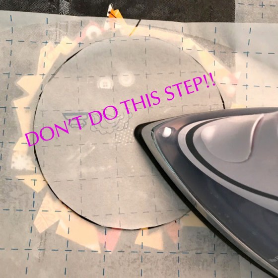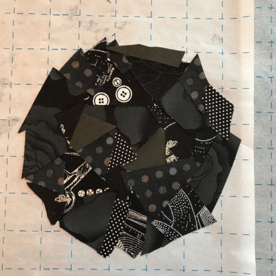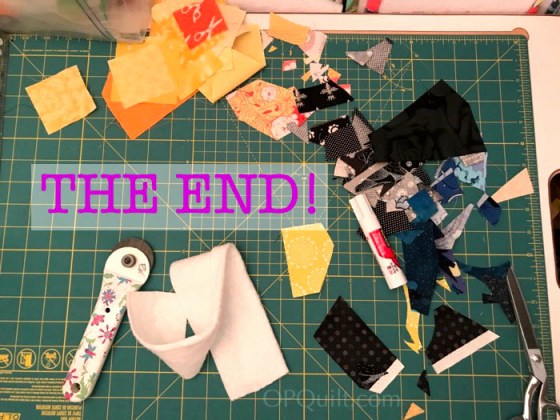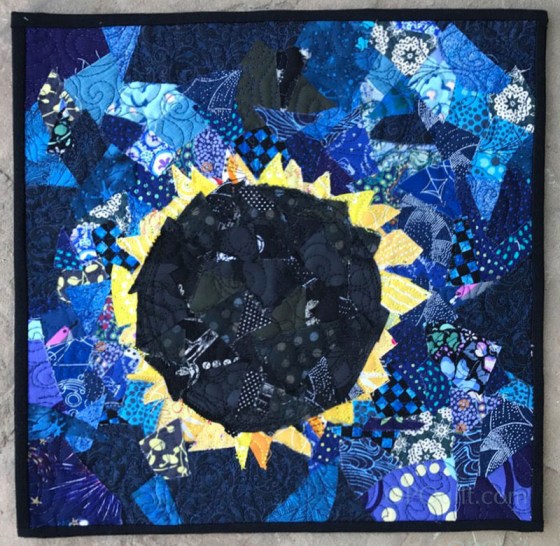 This is where I notice that the moon has two eyeballs staring right at me. And this is where I go get some more scraps, use a regular old-school glue stick and paste more fabric scraps over the eyeballs (you don’t see it in the first one, do you?). Quilt, again. And then I thought that the moon looked more like a black lump of coal than the moon (even though it does have a mountain-y horizon…it’s not THAT bumpy). More scraps glued on, more FMQ. I finished up by going in giant circle around the perimeter of the moon, to reinforce that Orb in the Sky thing.