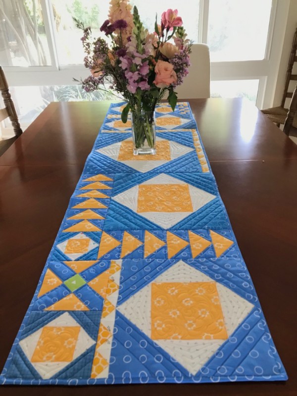 I’m standing underneath my quilt Azulejos, hanging in the gallery at Road to California in January 2020, before Covid-19 and all the Murder Hornets were released and when the world turned upside down. Well, I’ve been wanting to make this pattern in deep blues and cheddars, and I finished it this week.