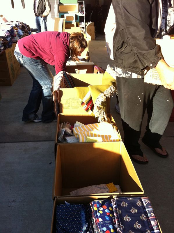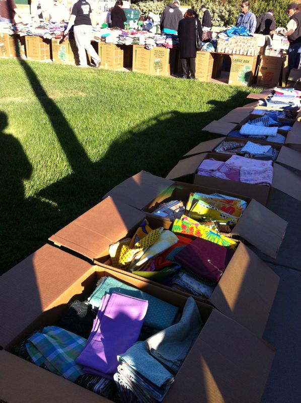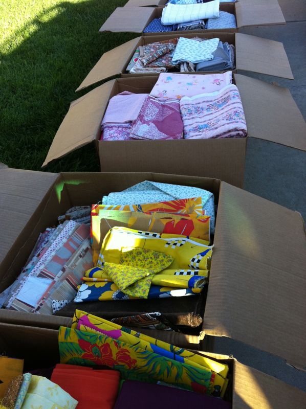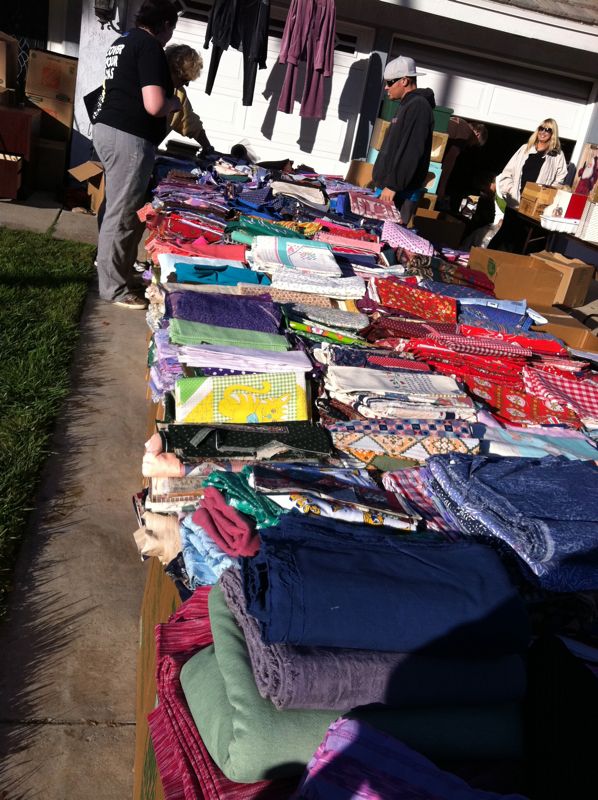 They’d dragged out their ping-pong tables, some sheets of plywood and set out a few stacks of fabrics to entice us. I found a stack of ginghams. More for my stash. There were a few interesting vintage pillowcases/sheets. I got a few of those. Actually I turned one of the pillowcases into a bag in case I needed to pick up more.