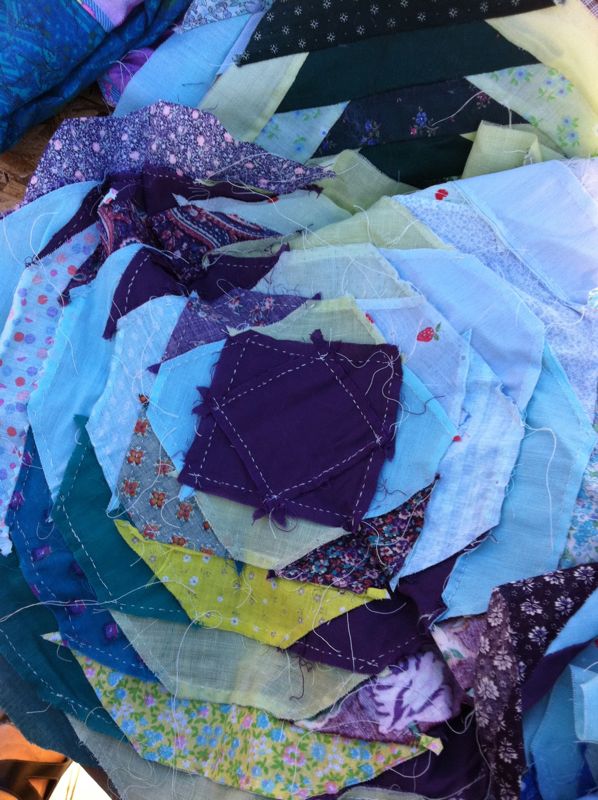 There were even some hand-pieced pineapple blocks, but I didn’t pick them up because I want to make my own pineapple quilt, and the combination of fabrics ranged from sheet batiste to a heavy twill. And strange color combinations, as you can see. By this time, as I was lugging my pillowcase of ginghams and sheets, the jokes started among the quilters that were there. Can you see our daughters having to do this when we all kick off? Poor Barbara, her friend Shawnie said. Poor you, Barbara said. Your mom’s a quilter, too.