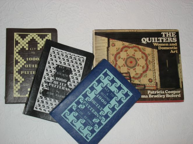 I walked back and found what few books there were, and selected some to go. Three of a four-book series on 1000 patchwork blocks. It reminds me of my Encyclopedia of Quilt Pattern by Barbara Bachman, but a lot more home grown. I’ve had fun looking through them.