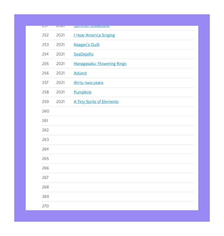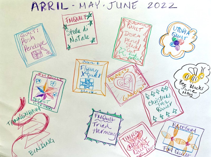 I chose this remedy: a list. Long ago in a lifetime far away I used to hang with the Finish-A-Long crowd, writing up quarterly lists, etc. Once I got into the habit of finishing, I bowed out. But since the pandemic seems to have scrambled our brains, I thought it was a method of organization worth dredging up again. One of my rules is to hand-draw the chart. At first I could only come up with one, but no worries, everything soon piled on.