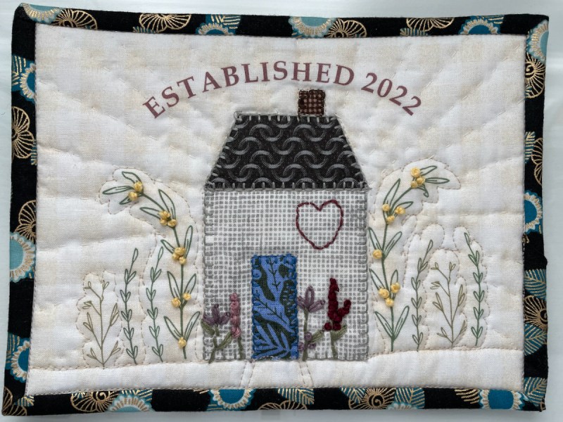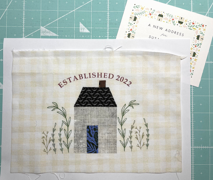 I sketched in the dimension with pencil, then marked evenly around the outer upper edges. Using masking tape as a guide, I hand quilted rays of sunshine emanating from her new house, hopefully wishing her happiness.