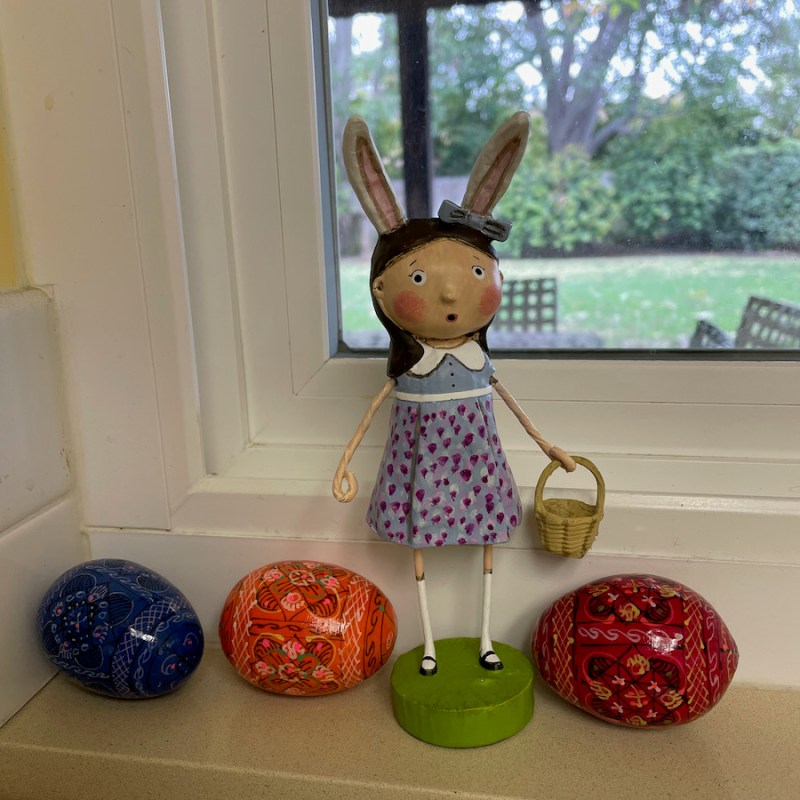 Wednesday, March 30. Pre-Op 7:30 a.m. and first time to meet the surgeon. Definitely a Very Nice Surgeon. Then up to JeniBee craft market, where I could have purchased too many things, but so fun to be doing “normal” craft market shopping. With people. I did buy some Ukranian wooden eggs, which took up residence beside Elenor Easterly: