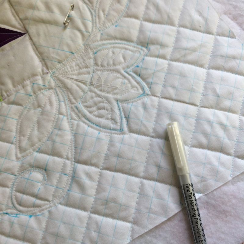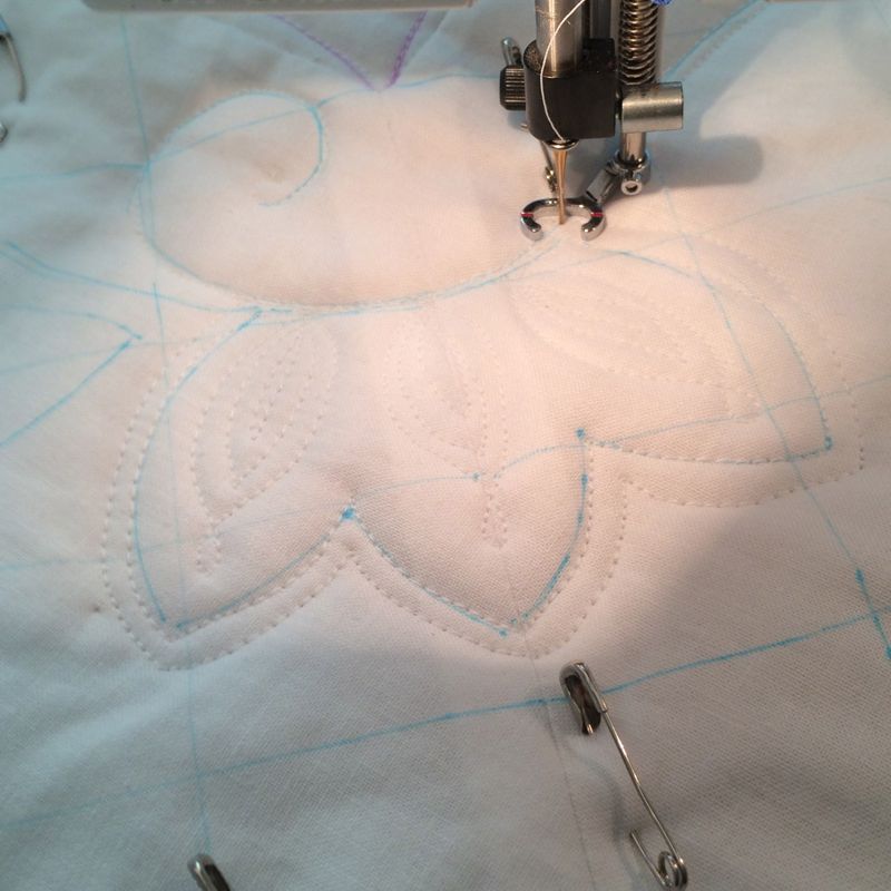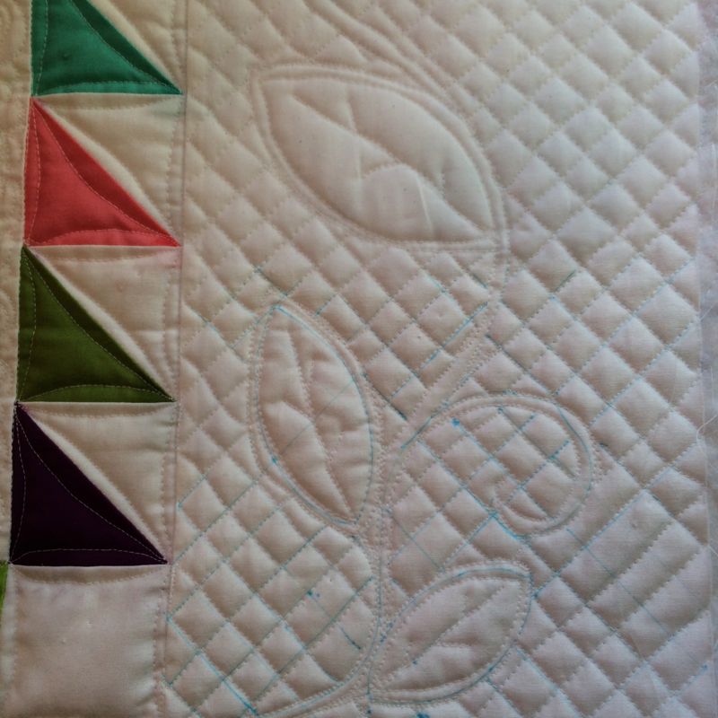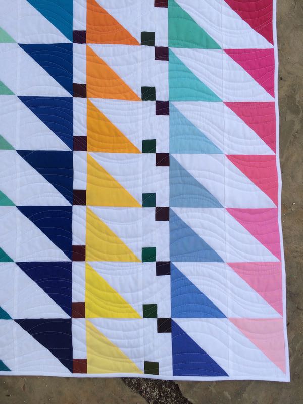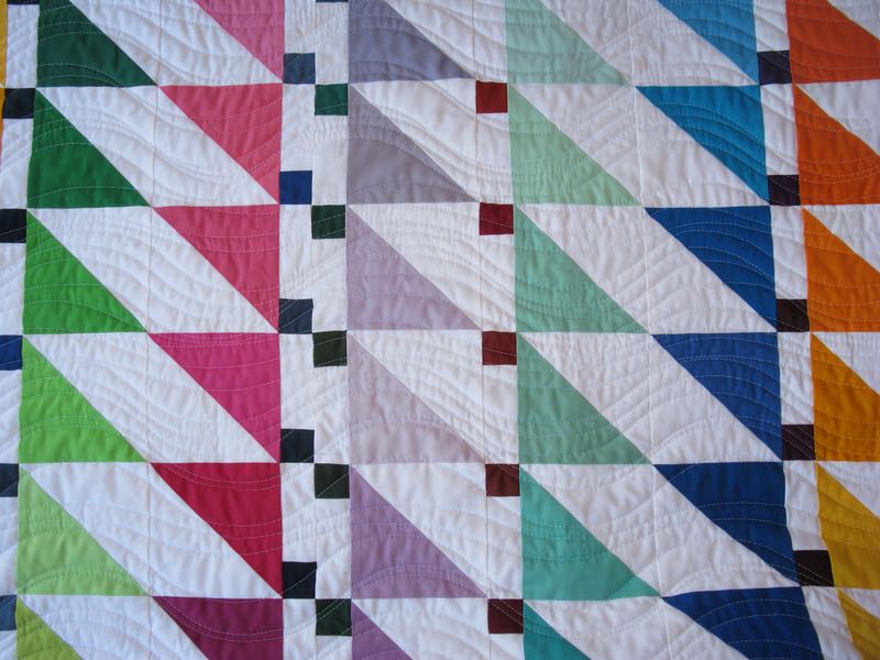 I think the half-square triangles look like a series of nautical flags, waving in the wind. I decided to quilt it also in a wavy pattern, but didn’t want a tightly controlled wave.