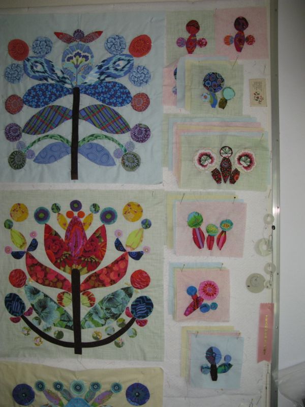 More This and That: This is the shot of a bolt end of Thermolam Plus–the stuff I have up on my pin wall. It looks like quilt batting, but it’s not. A friend was asking me about how I built my pin wall: 2 sheets of 1/2″ foam core art board taped side by side, covered with gridded flannel (I wrapped this to the back and stapled in place using really short staples, then covered that with tape. I then affixed it to my wall by using door jamb covers–long rounded metallic bars, each about six feet in length. I used four: two for each side, top and bottom). Over that, I layered this Thermolam Plus, using straight pins to anchor it into place. The fabric really sticks to it–like magic, and when it gets all thready, use one of those sticky roller things that is used to clean off clothes.