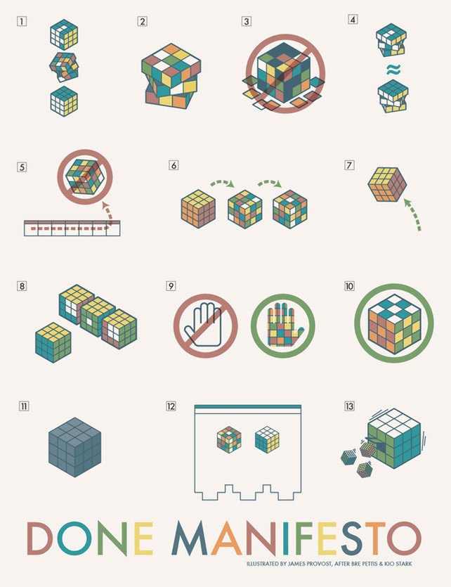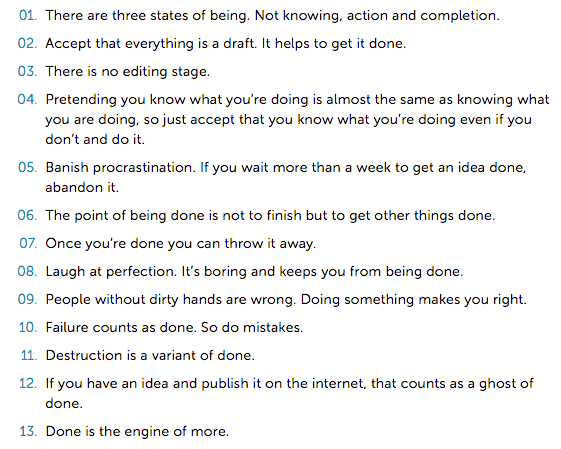 Since, during summer, Friday is my FSF–Finishing School Friday, I thought I’d mention this idea of the Done Manifesto, created when “Bre Pettis, an inventor, and collaborator Kio Stark gave themselves exactly 20 minutes to create a manifesto encapsulating everything they knew about bring a creative vision to life.” (from Infographic of the Day: 13 Rules)