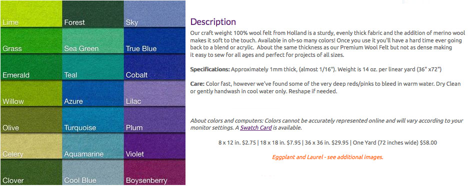 The first one is A Child’s Dream. Above snapshot is from their website; they have several different thicknesses and many more colors, but I went for the “Holland wool felt” type of wool.