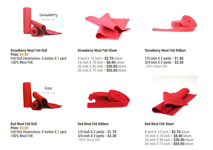 The second is The Felt Pod. Again, a snapshot from their website shows many of their different products in their wool felt. This is the “Reds” page.