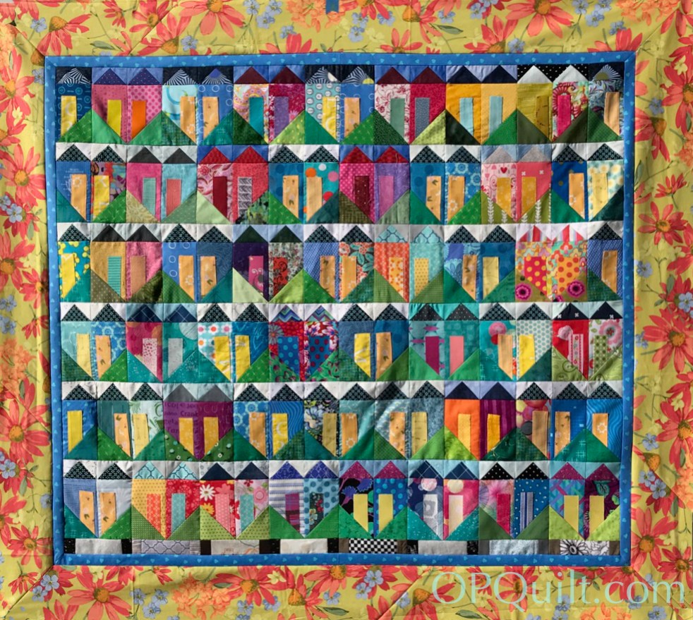 Of course, it’s not finished yet…not quilted or bound. I’m just about at Week 9 of rotator-cuff recovery, and using my quilting machine is a good three months down the road. But that gives me lots of time to think about how I’ll quilt it up. Thanks to all my beemates and friends who made and sent houses. I think this is the fastest I’ve made up a bee quilt, ever!