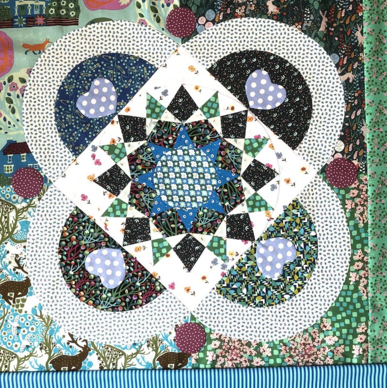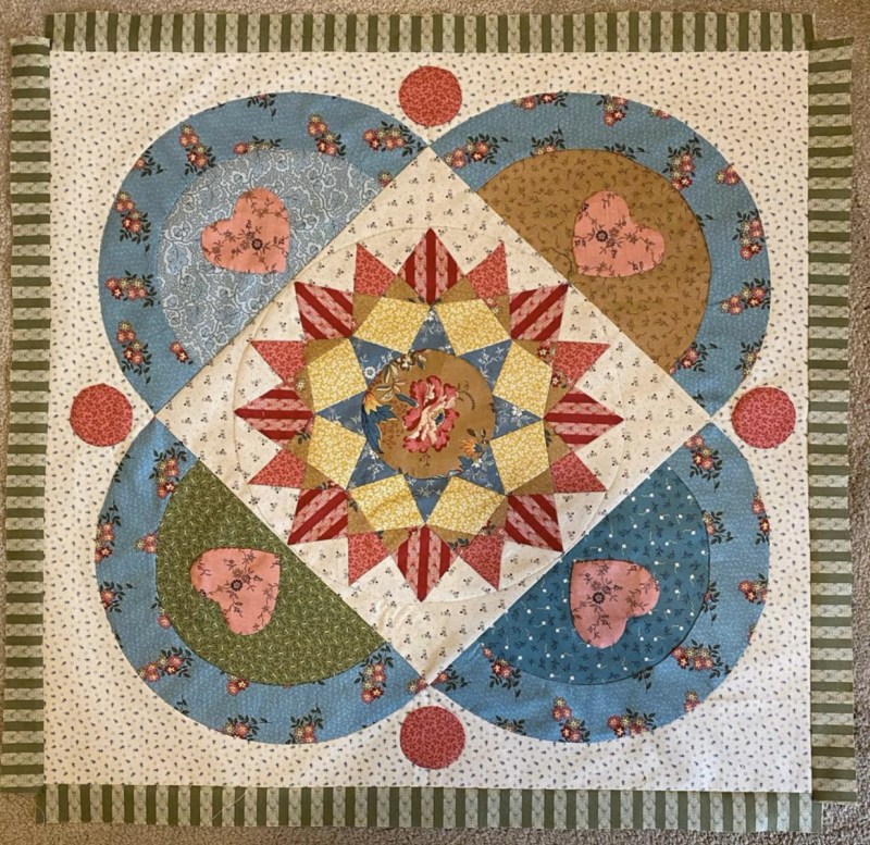 So, this is the last of Heart’s Garden. I will post photos from our other makers in a future post, as I so appreciate all the beautiful quilts they are making, and believe they are worth letting you know about. I’ll have some time in the next little while to do more hand-stitching on this quilt, so I decided not to rush for a blog deadline. It will evolve and change, but I don’t feel like I have to do too much. . . just enough fun stitches to make me happy.